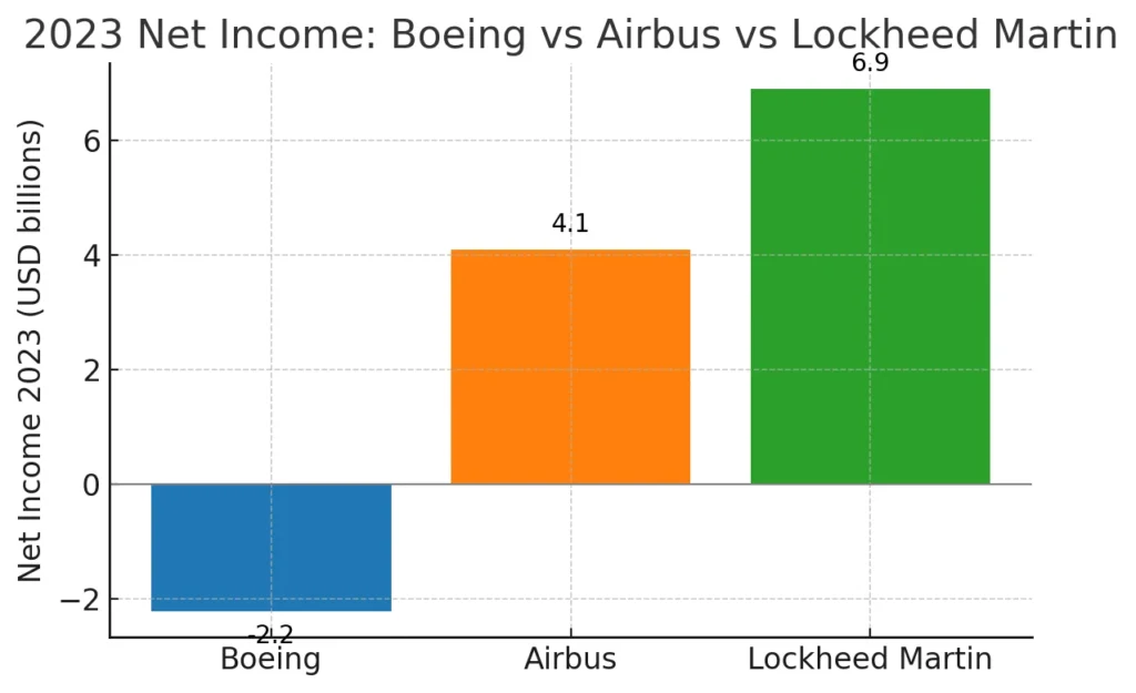 In terms of revenue, Boeing reported $77.8 billion in 2023, ahead of Airbus’s $70.8 billion (converted) and Lockheed Martin’s $67.6 billion. However, Boeing’s sales were unstable, falling 14% in 2024, whereas Airbus maintained 11% year-on-year growth and delivered 735 aircraft compared to Boeing’s 528.