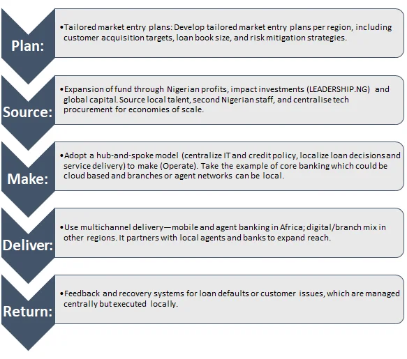 This is a market development move in Ansoff’s Matrix (offering existing services (digital banking, SME lending) in new countries. It is a global strategy which replicates Sterling’s Nigerian model (OneBank, Specta) in markets such as Kenya, India or UAE with little adaptation. It allows for brand consistency, centralizing tech and product management, and economies of scale.