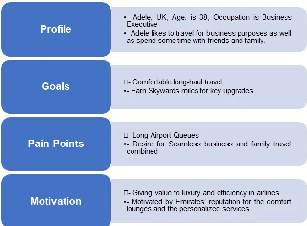 | Activities | Adele uses an app to boost the First Class | Adele uses the fast-track check-ins with lounge access | She is escorted, and before boarding | She enjoys the suit darning | Adele uses the fast-track and private arrival | Rates derive and skywards integration |