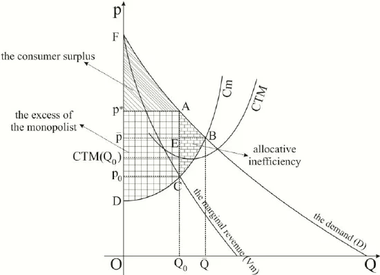 The following diagram illustrates the inefficiency in a monopolistic market: