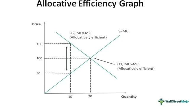 The allocative efficiency-graph shows a market situation in which resources are proactively availed to consumers to ensure the maximum attainment of both consumers’ and producers’ surplus. The equilibrium price is found where the demand and the supply curve cross, in this case point E where S = MC. The optimal level of smartphone consumption to attain this maximum total utility is Q1, at a price of 100, where the marginal utility equals marginal cost and allocative efficiency. Another point noted on the above graph is that initially, the opportunity cost of making more goods and services is greater than the marginal utility (MU > MC) till the optimum level of production (Q2) is achieved meaning that production will enhance welfare of the society. This VPV underscores the situation or state in which the market is most efficient at distributing resources, where supply and demand are at near parity.